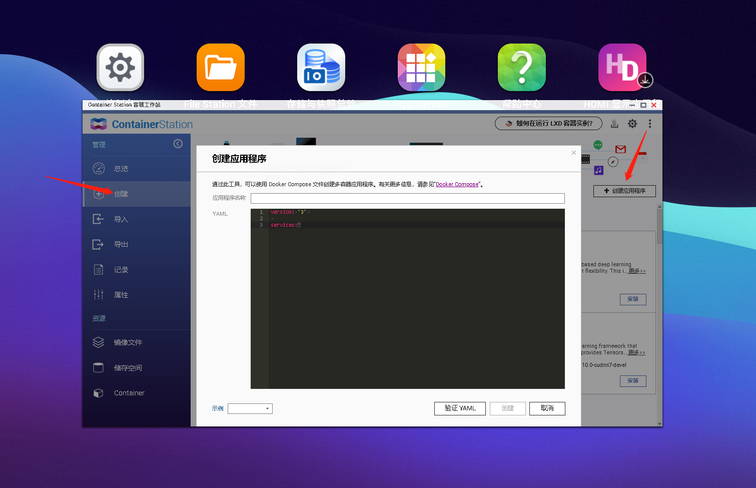Container Station下载好后打开,在创建里面找到创建应用程序,如下图所示: